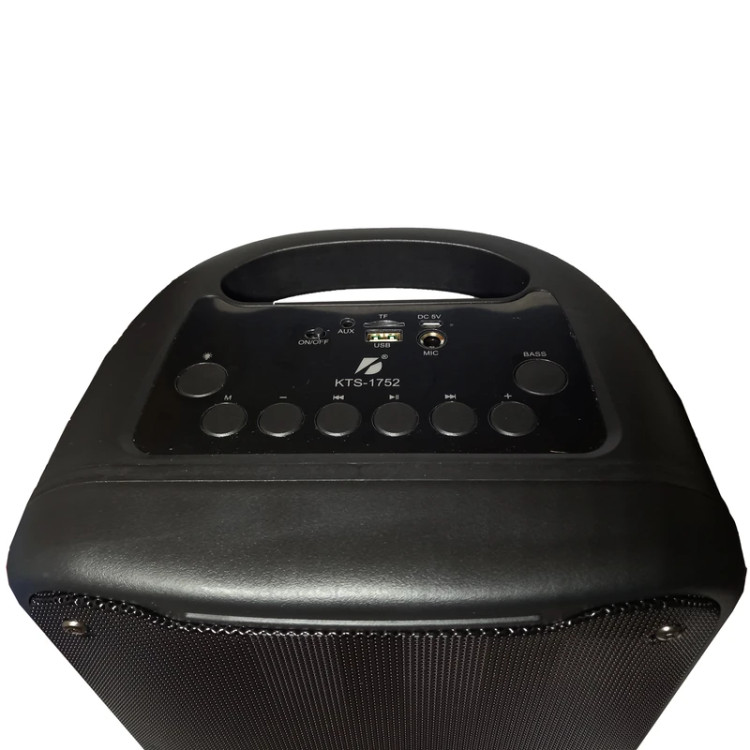 اسپیکر بلوتوثی قابل حمل مدل KTS-1752 با ابعاد 36*19.7*24 سانتیمتر طراحی شده است. این طراحی جمعوجور و شیک، امکان حمل آسان و استفاده در مکانهای مختلف را فراهم میکند. با وزن 2300 گرم، این اسپیکر نسبتاً سبک است و میتوان آن را به راحتی حمل کرد. اسپیکر داخلی این دستگاه با قطر 8 اینچ، صدای قدرتمند و با کیفیتی را تولید میکند که تمامی نیازهای شما را برآورده میسازد.
