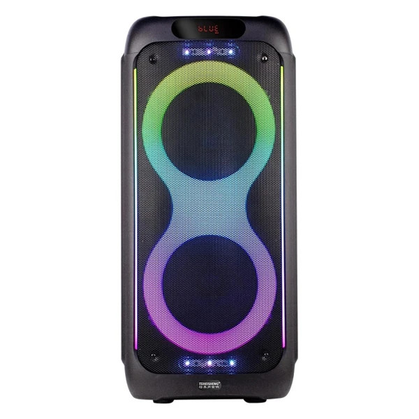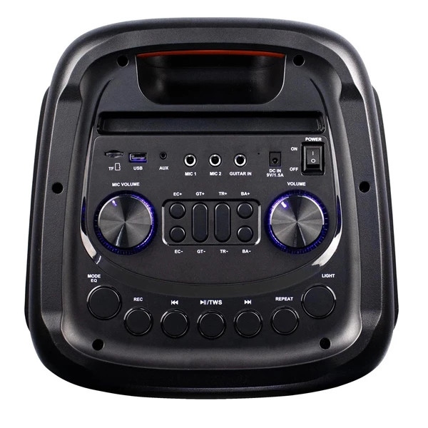 این اسپیکر دارای پارتی لایت بسیار زیبا و حساس به صدا که طراحی شبیه پارتی باکس های jbl دارد را در خود جا داده است که می توانید آن را به چند حالت مختلف تغییر دهید همچنین بر روی پنل این اسپیکر کلیدهای کنترل کنننده کاملی تعبیه شده که توسط آن قادر به تنظیم دستگاه خواهید بود.