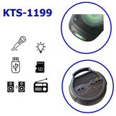 پارتی باکس بسیار قدرتمند. اسپیکر شارژی و قابل حمل 1199 یکی از پر فروش ترین محصولات شرکت Kts می باشد که طراحی فوق العاده این اسپیکر وجه تمایزی بر بقیه محصولات این شرکت شده است.صدایی فوق العاده بلند و با کیفیتی را تولیدمی کند. طراحی و ساختار دینامیک استوانه ای این محصول به جذابیت مثال نزدنی آن چندین برابر افزوده است.همچنین این دستگاه از تمام امکانات مولتی مدیا نظیر بلوتوث،فلش،مموری، ای یو ایکس و... پشتیبانی کرده و توسط ولوم های تنظیم کننده اکلایزر می توان جنس صدای آن را من باب سلیقه خود تنظیم کرد.از قابلیت دیگر آن می توان به وجود پارتی لایت هایی در بدنه و کف این دستگاه اشاره نمود که توسط کلید تعبیه شده در پنل و کنترل میتوان آن را خاموش یا تغییر رنگ داد.از این دستگاه می توانید در جشن های نسبتا بزرگ خانوادگی استفاده کرده و لحظات شادی را توسط آن رغم بزنید ، همچنین این اسپیکر داری قابلیت ویژه TWS است که توسط آن می توانید دو عدد از این اسپیکر را از طریق شبکه بی سیم به هم دیگر متصل و از صدایی استریو و جذاب لذت ببرید. این اسپیکر مناسب افرادیست که برایشان قدرت دستگاه حائز اهمیت است.