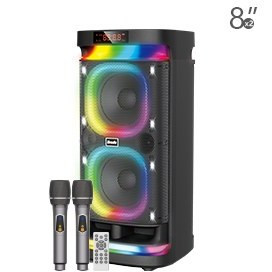 داخل باکس این اسپیکر دو عدد میکروفن وایرلس قرار دارد که می توانید توسط آن لحظات مفرحی رو به خوانندگی و شنیدن موسیقی بپردازید.