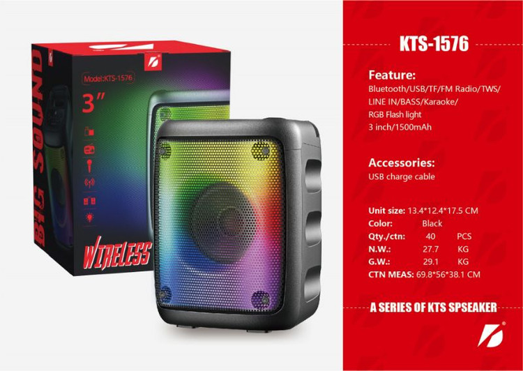 یکی از شاهکارهای شرکت بزرگ کی تی اس است. kts این اسپیکر کوچک را به قدرتی تجهیز کرده که هر مخاطبی را به وجد میاورد. اسپیکر KTS مدل 1576 طراحی مربعی شکل دارد که این موضوع باعث میشود هم بتوان از آن مانند یک اسپیکر دسکتاپ و هم به عنوان یک اسپیکر قابل حمل استفاده کرد. ارتفاع این اسپیکر ۱۸ سانت می باشد. همچنین پنل جلویی این اسپیکر تمام ال ای دی است و شما با خرید این اسپیکر کابل شارژ هم دریافت می کنید.این اسپیکر نیز مجهز به کلید تغییر رقص نور و کلید مگا بیس می باشد.